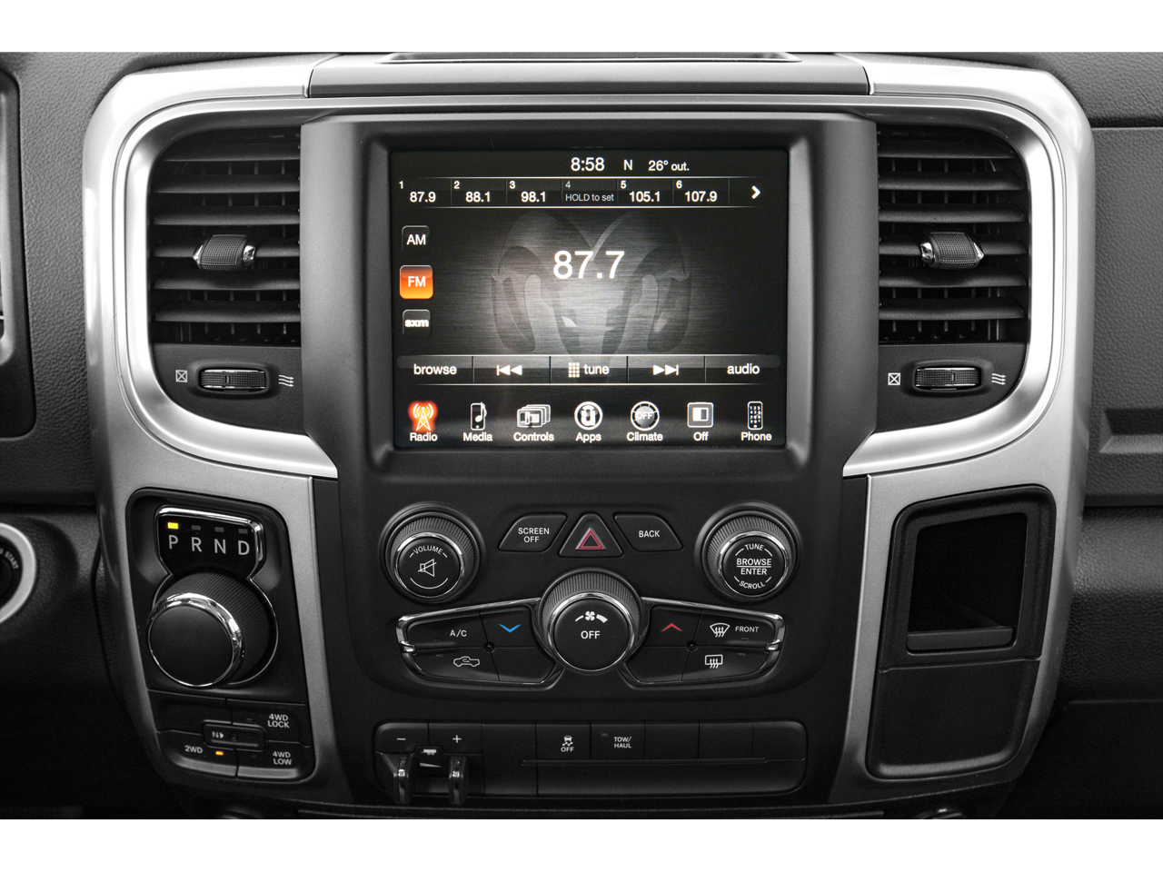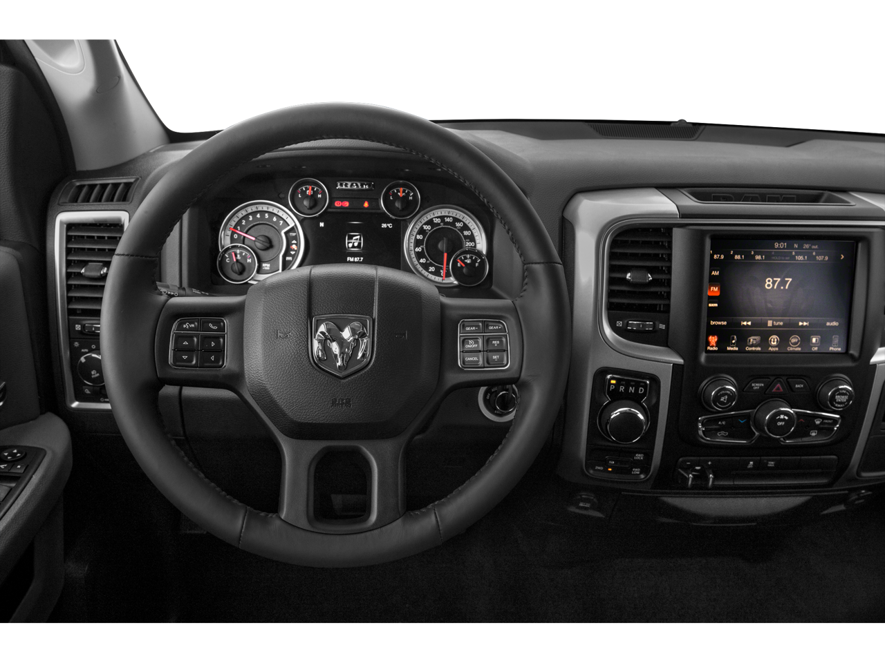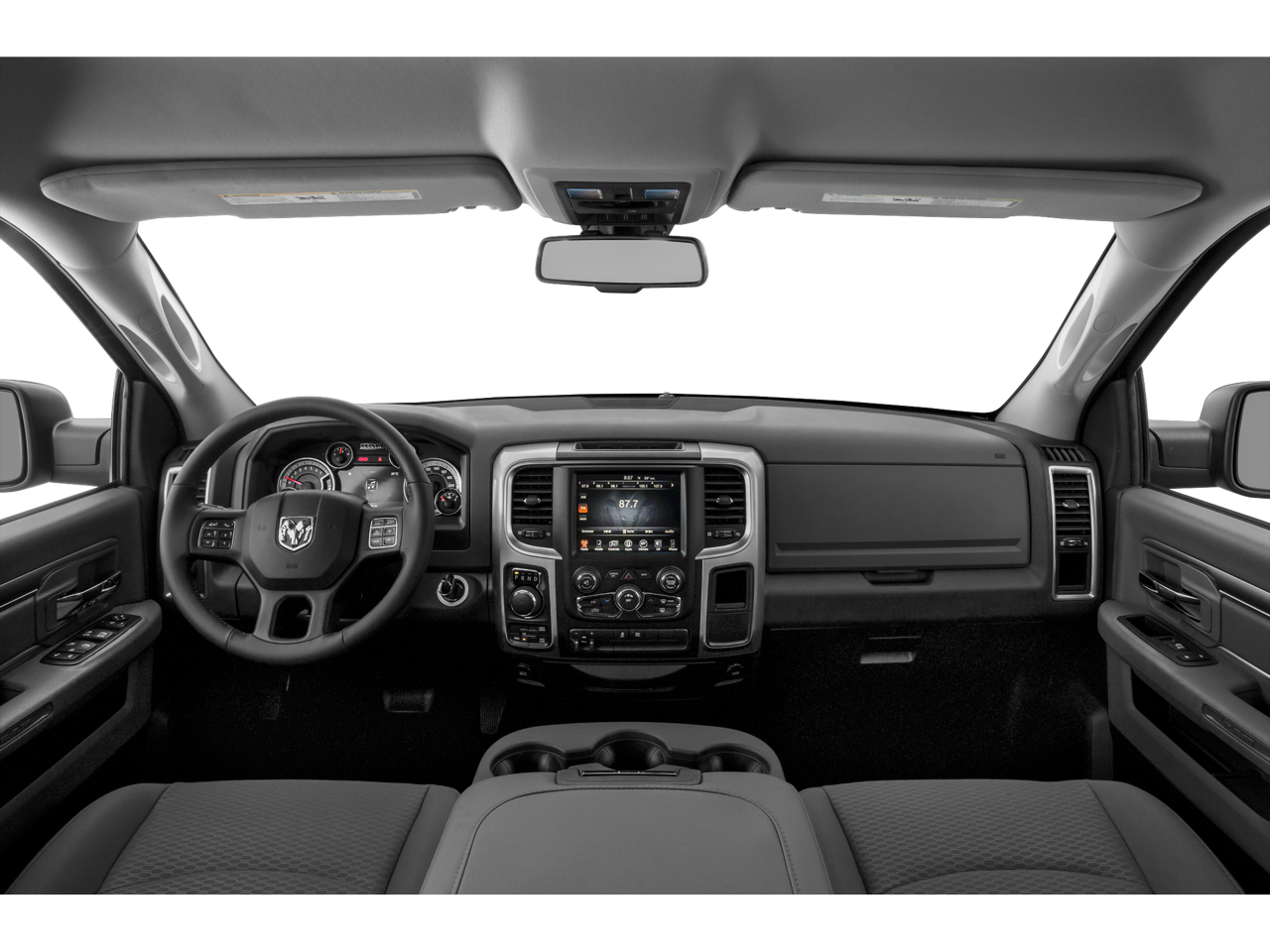 This vehicle includes the following Features: 3.21 Rear Axle Ratio, 4-Wheel Disc Brakes, 40/20/40 Split Bench Seat, 6 Speakers, ABS brakes, Air Conditioning, Alloy wheels, AM/FM radio: SiriusXM, Black Exterior Mirrors, Brake assist, Bumpers: chrome, Center Hub, Compass, Delay-off headlights, Driver door bin, Dual front impact airbags, Dual front side impact airbags, Electronic Stability Control, Exterior Mirrors w/Heating Element, Front anti-roll bar, Front Armrest w/3 Cupholders, Front Center Armrest w/Storage, Front reading lights, Front wheel independent suspension, Fully automatic headlights, GPS Antenna Input, Heated door mirrors, Illuminated entry, Integrated Voice Command w/Bluetooth®, Low tire pressure warning, Manufacturer's Statement of Origin, Occupant sensing airbag, Outside temperature display, Overhead airbag, Overhead console, Panic alarm, ParkView Rear Back-Up Camera, Passenger door bin, Passenger vanity mirror, Power door mirrors, Power steering, Power windows, Radio data system, Rear anti-roll bar, Rear Floor Mats, Rear seat center armrest, Rear step bumper, Remote keyless entry, Remote USB Port - Charge Only, Speed control, Storage Tray, Tachometer, Tilt steering wheel, Traction control, Trip computer, Variably intermittent wipers, and Voltmeter.